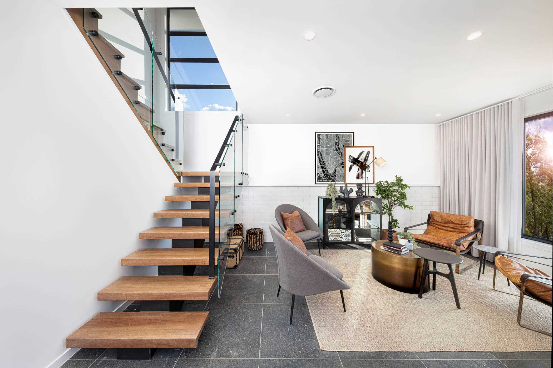 • Stained timber stair treads and risers, including stringer, handrail and posts (Durian Timber).